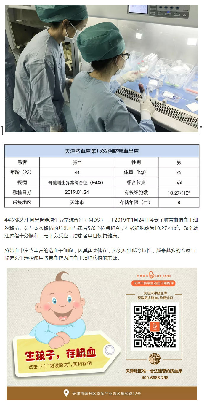 出库案例 | 天津市脐血库第1532例脐带血出库,治疗骨髓增生异常综合征(MDS)