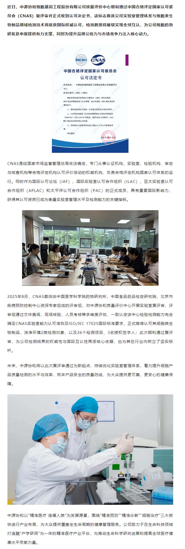 喜讯!中源协和质量评价中心顺利通过CNAS 复评审,再获认可决定书