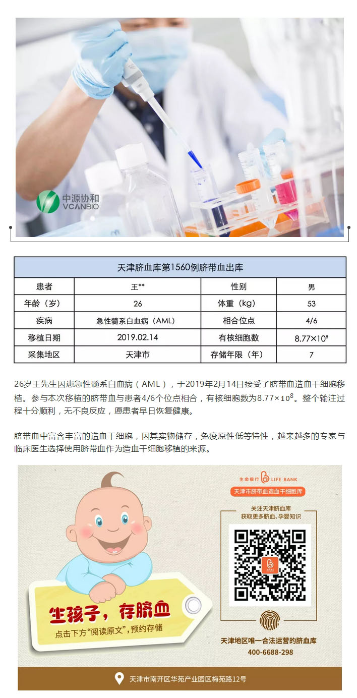 出库案例 | 天津市脐血库第1560例脐带血出库,治疗急性髓系白血病(AML)
